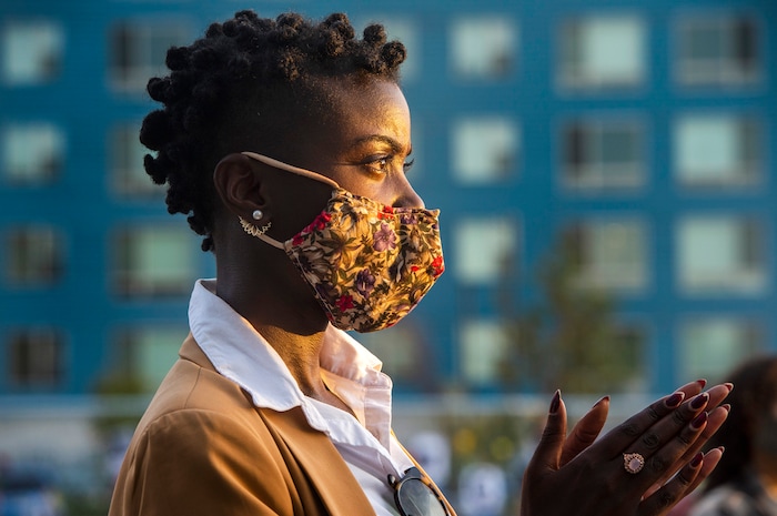 (Rick Egan | The Salt Lake Tribune) Saerlyn Louissaint claps as Fatima Dirie speaks at the Say Their Names Memorial in Salt Lake City, on Saturday, Sept. 26, 2020.