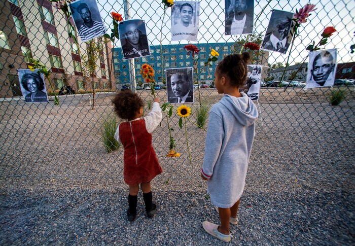 (Rick Egan | The Salt Lake Tribune) Courage Tamakloe and Manariyo Lenata add a photo to the Say Their Names Memorial in Salt Lake City, on Saturday, Sept. 26, 2020.
