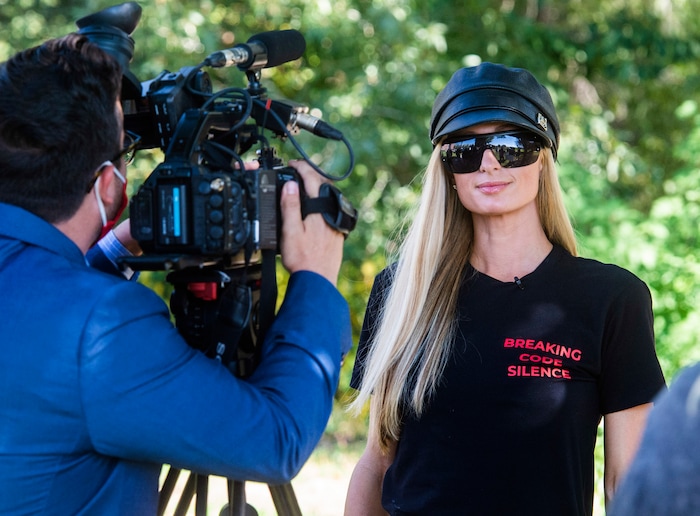 (Rick Egan | The Salt Lake Tribune) Paris Hilton leads a march to the Provo Canyon School, during a rally calling for the closure of Provo Canyon School, a residential treatment center in Utah she attended when she was a teen, on Friday, Oct. 9, 2020.