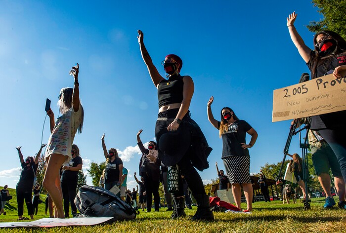 (Rick Egan | The Salt Lake Tribune) Cassandra Hardin, breaks down during a moment of silence at a rally calling for the closure of Provo Canyon School, a residential treatment center in Utah she attended when she was a teen, on Friday, Oct. 9, 2020.