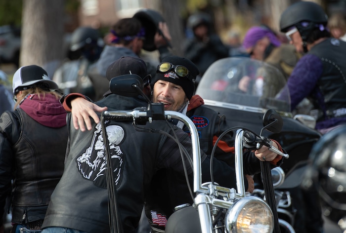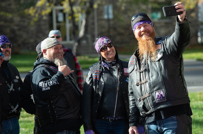 A group of nearly 30 bikers wearing leather jackets and purple bandannas rode into Liberty Park on Saturday morning, revving their engines and parking their gleaming motorcycles in a patch of sunlight on the southeast side of the park.