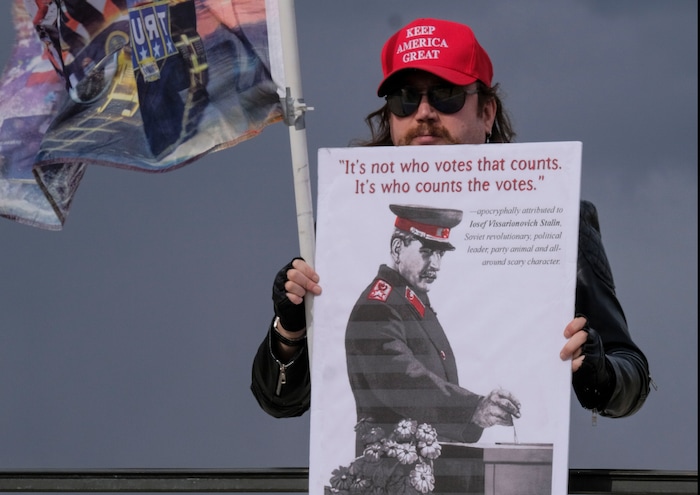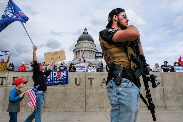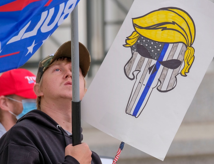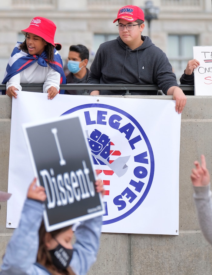 (Leah Hogsten | The Salt Lake Tribune) As news broke of former Vice President Joe Biden earning enough Electoral College votes to secure the presidency Saturday, Trump protesters took to the Capitol to denounce the win.