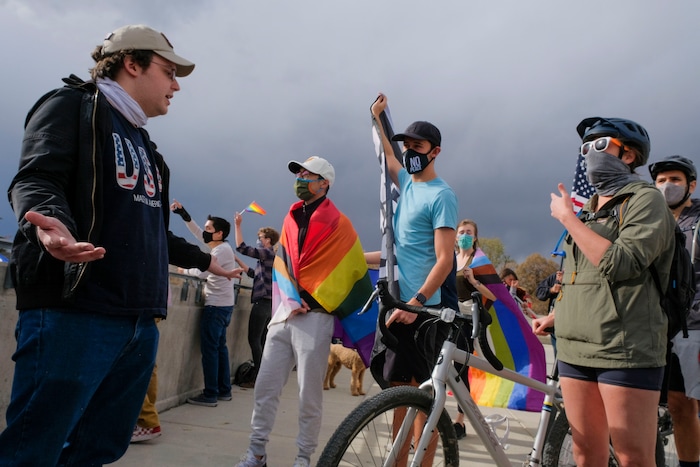 (Leah Hogsten | The Salt Lake Tribune) Charlie Kaing, Brogan Johnson and Viveca Falks got into a back and forth with a Trump supporter, left. As news broke of former Vice President Joe Biden earning enough Electoral College votes to secure the presidency Saturday, Trump protesters took to the Capitol to denounce the win.