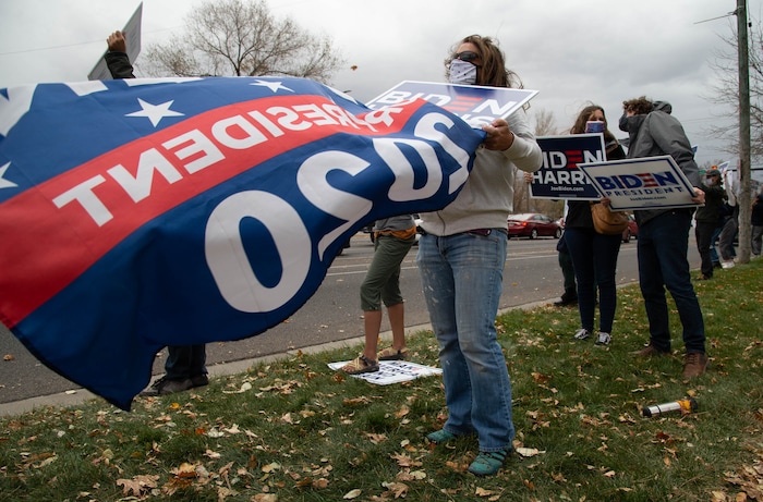 Dozens of Trump supporters and a smattering of Biden fans braved windy conditions to rally at the Capitol in the hours after the race was called. People who favor Biden waved signs and flags on the south lawn. Cars honked as they drove by. The Biden supporters chanted “this is what democracy looks like" and “all votes matter." They were outnumbered by Trump supporters who rallied on the steps chanting “stop the steal” and “we want Trump.”