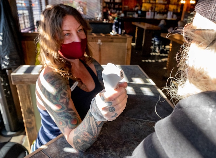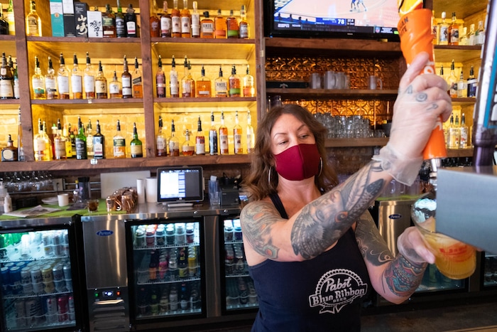 Under federal and state orders, bars and restaurants are allowed to operate if servers wear masks at all times; if patrons wear face coverings when they are not seated or actively eating or drinking and if there is a 6-foot distance between tables.