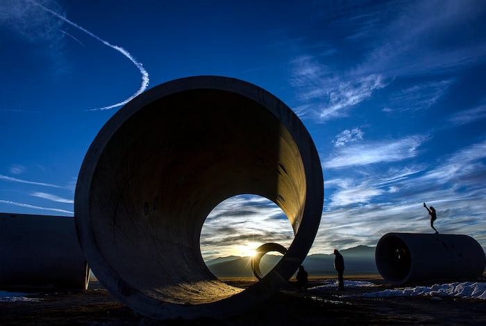 (Rick Egan | The Salt Lake Tribune) The sun sets through the famed Sun Tunnels sculpture, during a unique winter solstice in remote Utah's Great Basin Desert, on Monday, Dec. 21, 2020.