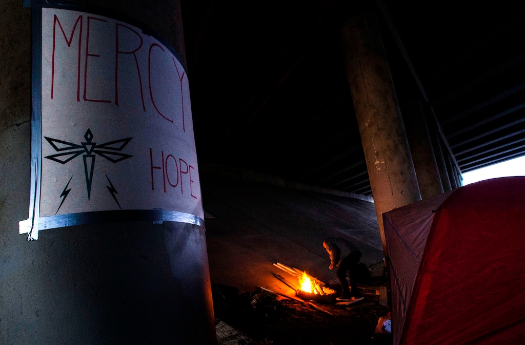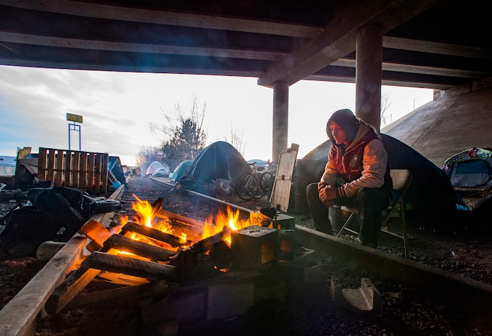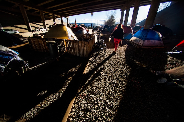 Nestled on either side of an out-of-use railroad track, dozens of tents reach toward the top of a Salt Lake City overpass — a concrete umbrella that provides a reprieve from snow, hail and rain but keeps in the smell and sound of crackling fires and the laughter and shouts of the people who live here.
