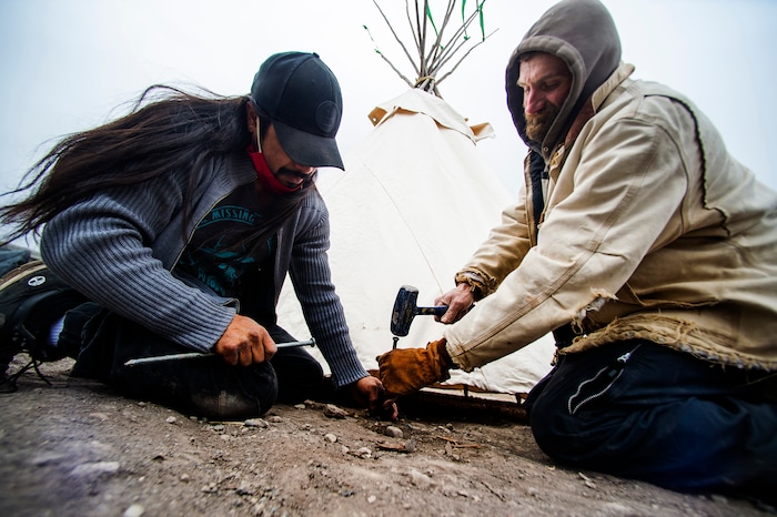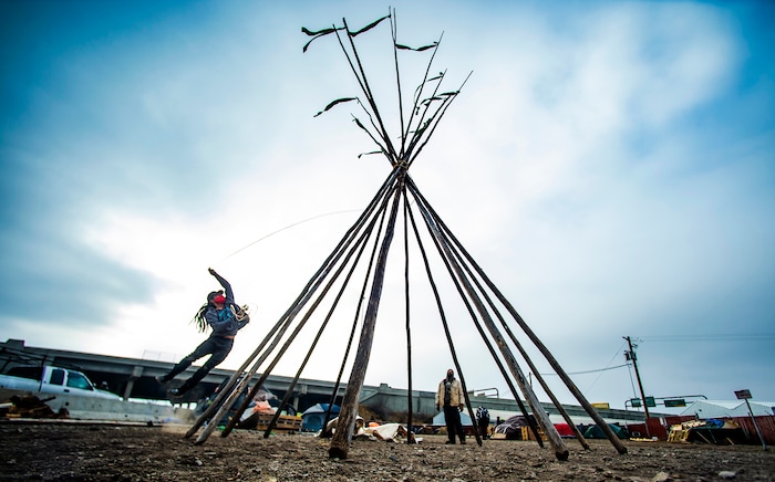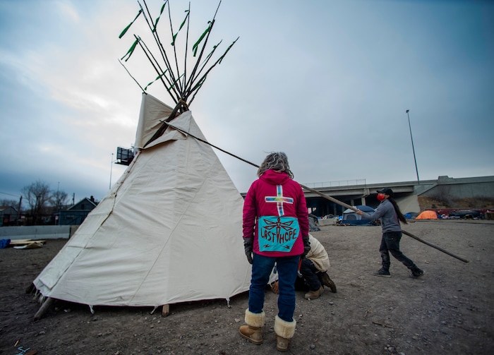 (Rick Egan | The Salt Lake Tribune) Carl Moore jumps to tighten the ropes as he erects a teepee at Camp Last Hope, Thursday, Dec. 31, 2020. The teepee was set up to help shelter people experiencing homelessness that lost their tents when they were forced to move.