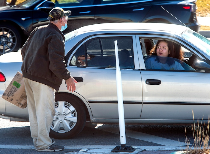 (Rick Egan | The Salt Lake Tribune) George Zinn responds to a woman who said derogatory things about President Donald Trump at the Utah Capitol, where a dozen protesters gathered on Sunday, Jan. 17, 2021.