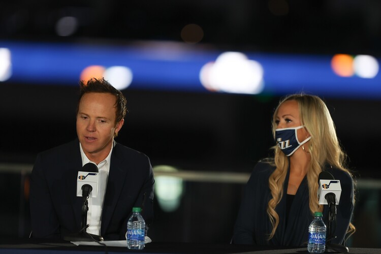 (Photo courtesy Utah Jazz/Melissa Majchrzak) Ryan and Ashley Smith talk about their plans to buy the Jazz on October 28, 2020. The Smiths are now contributing $2 million to Encircle's “$8 million, 8 Houses” campaign to build eight more homes in Utah, Arizona, Idaho and Nevada to provide safe spaces and prevent teen suicide, particularly among LGBTQ youth.