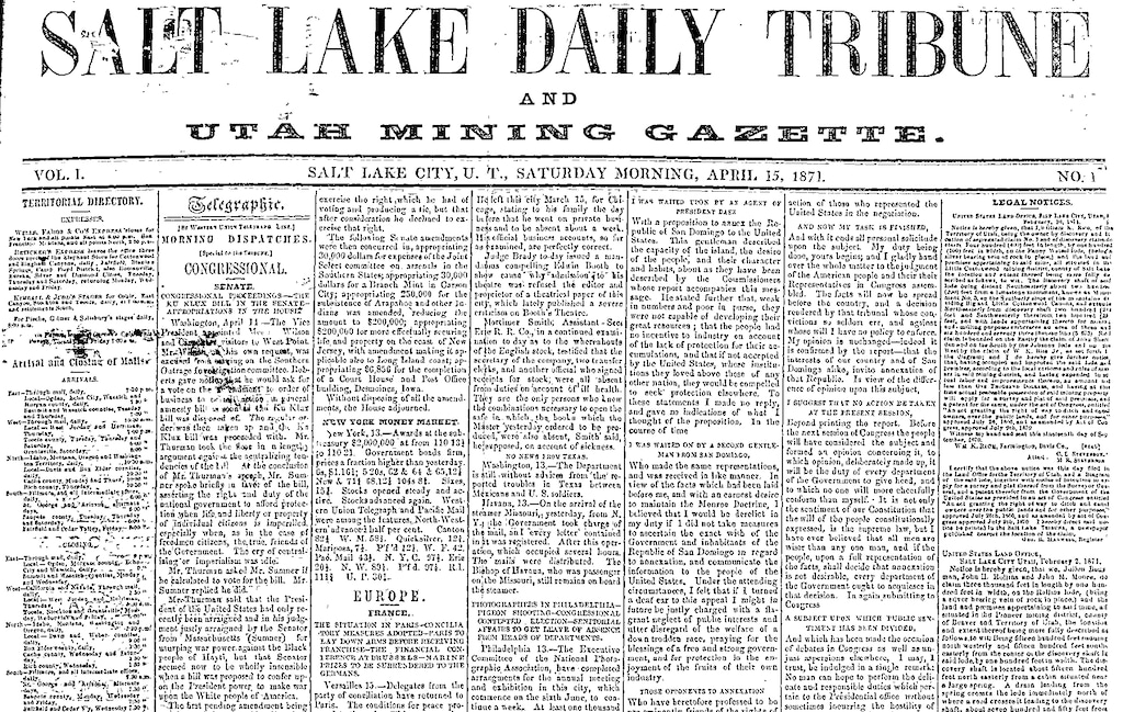 The first issue of the Salt Lake Daily Tribune and Utah Mining Gazette was printed April 15, 1871, and its front-page stories reflected what was important at the time.