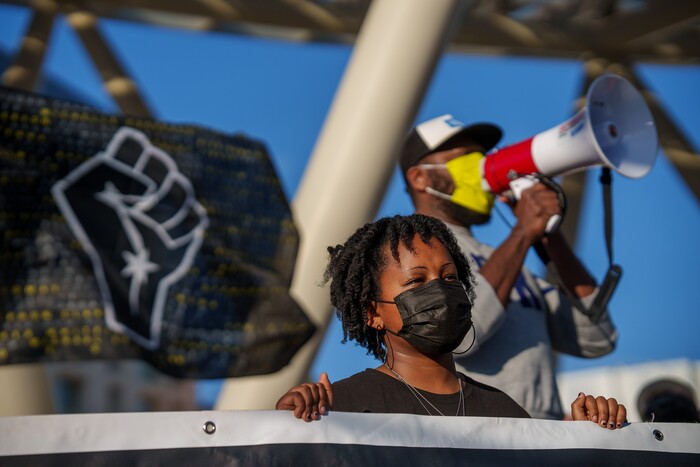 Here are some crowd shots. I'd estimate a few hundred people are here. They're being led in chants of, "Jail killer cops" and "Black lives matter" right now pic.twitter.com/fiDzQuVZE8