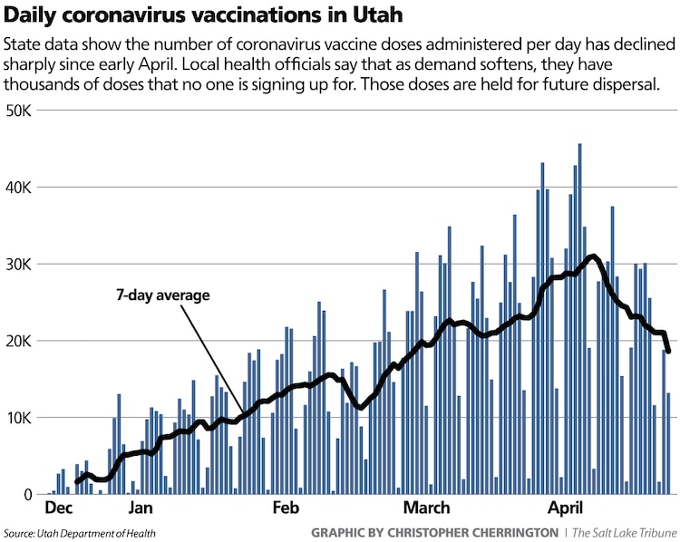 The number of new vaccinations statewide has declined by more than a third since it peaked in early April, when more than 30,000 Utahns were being vaccinated each day.