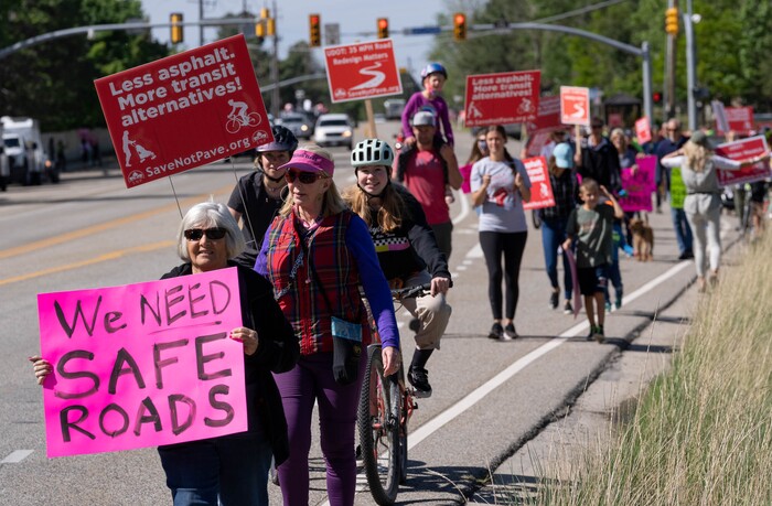 The Saturday morning rally was organized by Save Not Pave, an organization advocating for safer roads and transportation alternatives in Utah. Protesters gathered at Golden Hills Park and marched between Bengal Boulevard (7200 South) and 8300 South along Wasatch Boulevard.
