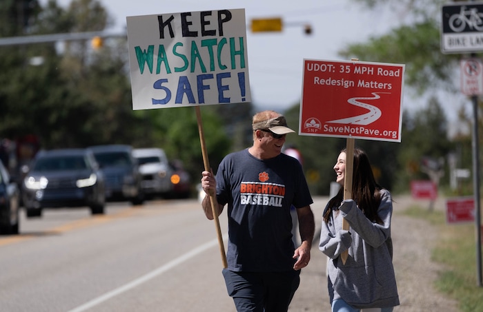 Residents of Cottonwood Heights and Sandy held aloft signs and waved to cars along Wasatch Boulevard to protest the Utah Department of Transportation’s proposed expansion of the road to alleviate congestion during ski season.