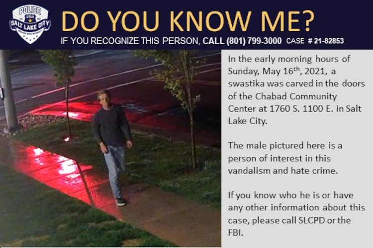 A swastika was scratched onto the glass door of Chabad Community Center in the early hours of May 16, and the individual is a person of interest in the hate crime investigation. People are asked to call Salt Lake City Police at 801-799-3000 if they can identify the man or have any other information about the crime.