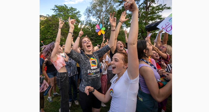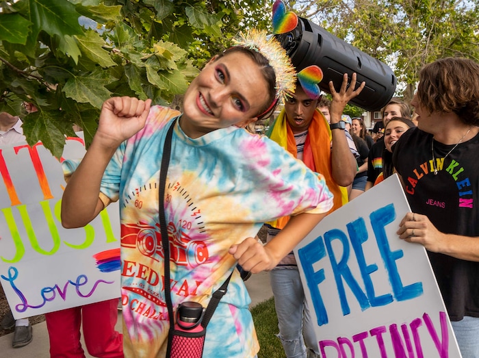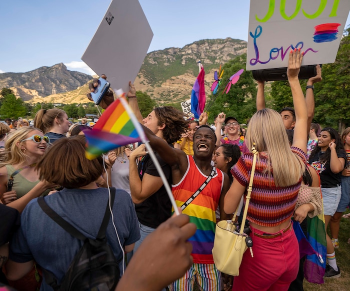 (Rick Egan | The Salt Lake Tribune) More than a thousand BYU students, friends and allies dance to Lady Gaga, during a Pride March from Joaquin Park to Kiwanis Park, in Provo, on Monday, June 28, 2021.