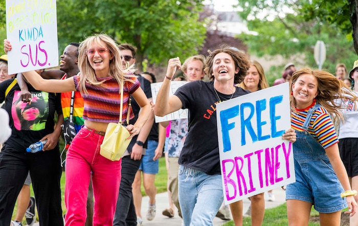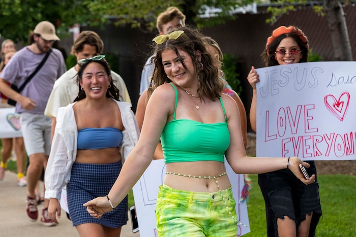 The crowd gathered at the park for speeches and instructions before marching to Kiwanis Park only blocks from the Latter-day Saint-owned campus, where they sang along and danced to the music of Lady Gaga, Britney Spears and Taylor Swift.