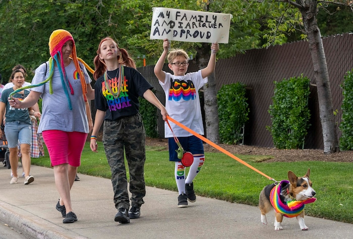 (Rick Egan | The Salt Lake Tribune) Laurel Arnold, walks with her kids, Lilly, 14, and Sam 12, and dog Tucker, march along with BYU students, friends and allies in a Pride March, to Kiwanis Park, in Provo, on Monday, June 28, 2021.