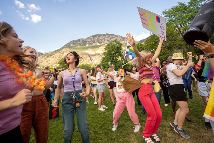 (Rick Egan | The Salt Lake Tribune) More than a thousand BYU students, friends and allies dance to the music of Lady Gaga, Brittney Spears and Taylor Swift, after a Pride March from Joaquin Park to Kiwanis Park, in Provo, on Monday, June 28, 2021.