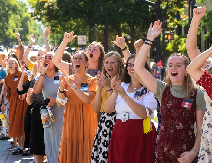 (Rick Egan | The Salt Lake Tribune) Sister missionaries from the Church of Jesus Christ of Latter Day Saints, Salt Lake Temple Mission, cheer for entries in the Days of '47 Parade, in Salt Lake City, on Friday, July 23, 2021.