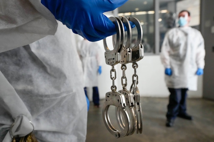 (Francisco Kjolseth | The Salt Lake Tribune) Prison staff at the Utah State Prison in Draper sanitize handcuffs as they work to safely remove inmates from their cells to be vaccinated against COVID-19 on Tuesday, July 27, 2021.