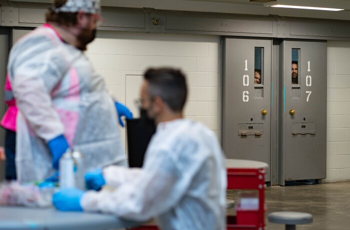One by one inmates who agreed to get the vaccine were walked from their cell and given the shot in the day room just outside their cells.