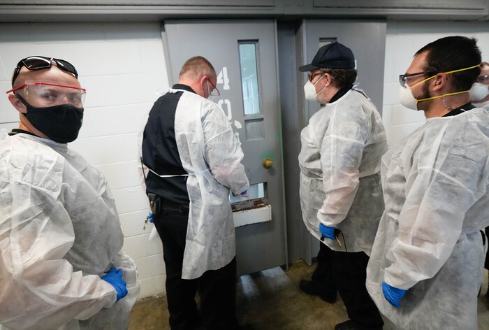 (Francisco Kjolseth | The Salt Lake Tribune) Prison guards suit up in PPE gear at the Utah State Prison in Draper on Tuesday, July 27, 2021, before a vaccination event with incoming inmates who want the COVID-19 vaccine.