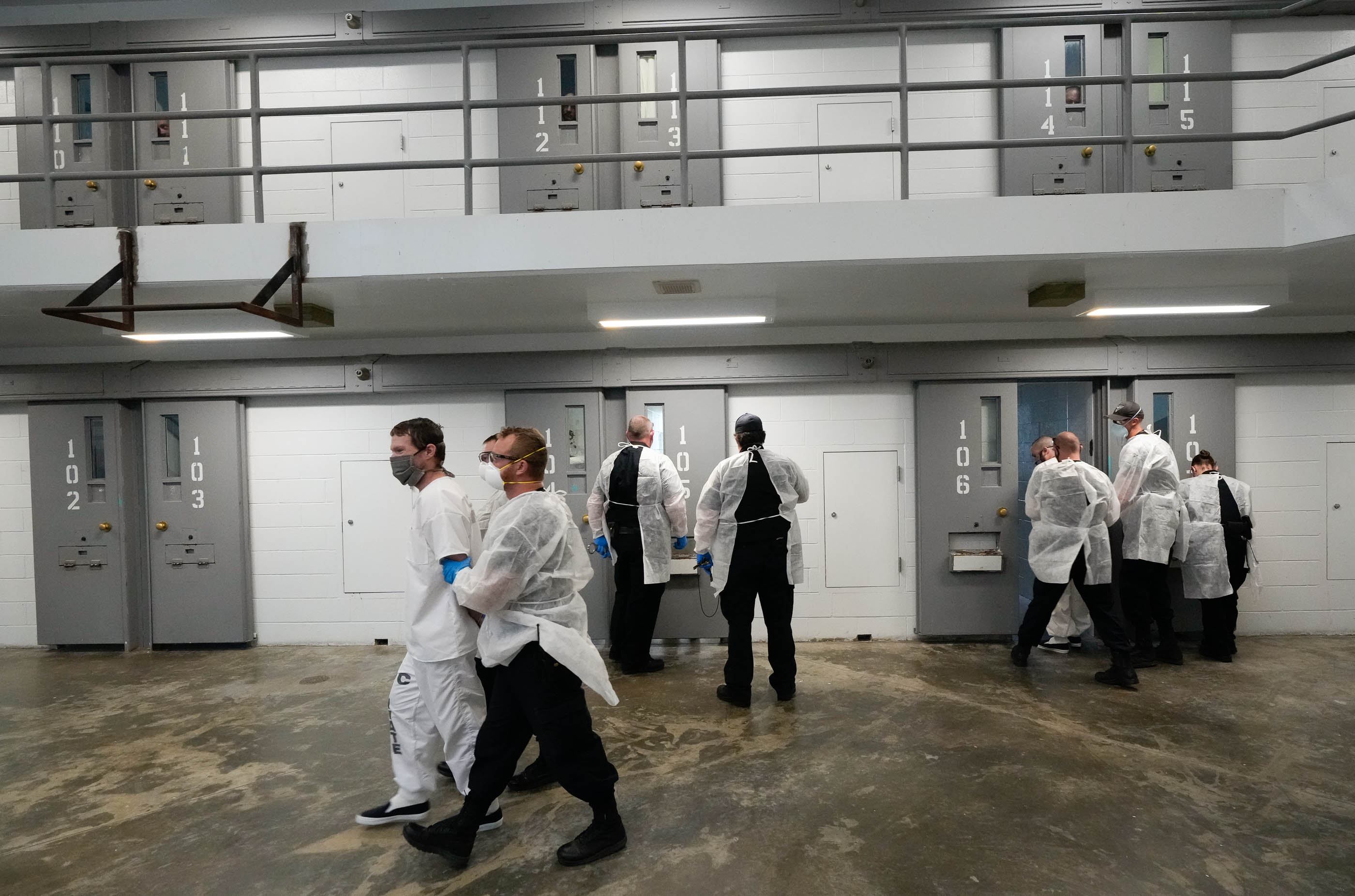 (Francisco Kjolseth | The Salt Lake Tribune) Prison staff work to safely move inmates from their cells into the common day room to be vaccinated against COVID-19 during a vaccination event with interested incoming inmates at the Utah State Prison in Draper on Tuesday, July 27, 2021.