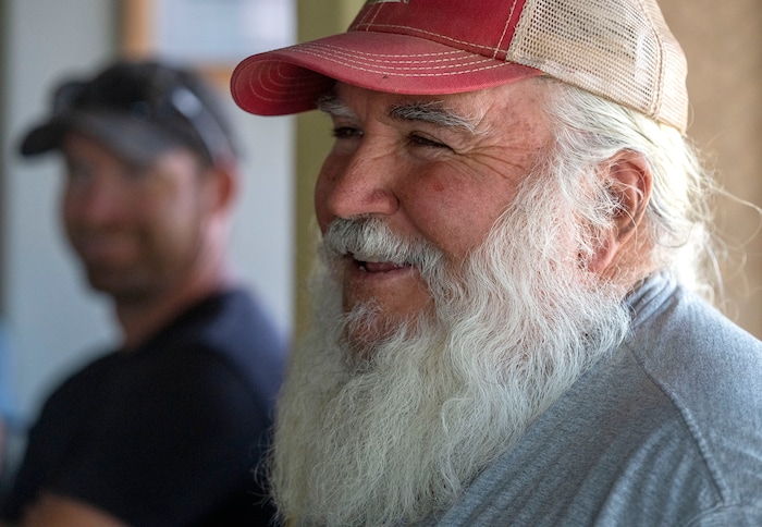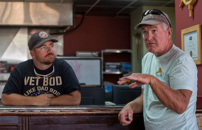 (Rick Egan | The Salt Lake Tribune) Big Water business owners, Robert Wilkes, listens to Bob Reed, as they discuss the problems with the low water level and the boat ramps, at Lake Powell, on Tuesday, Aug. 3, 2021.