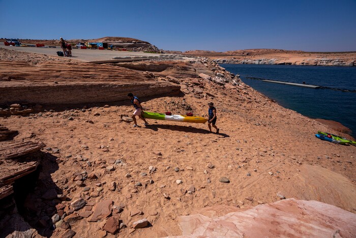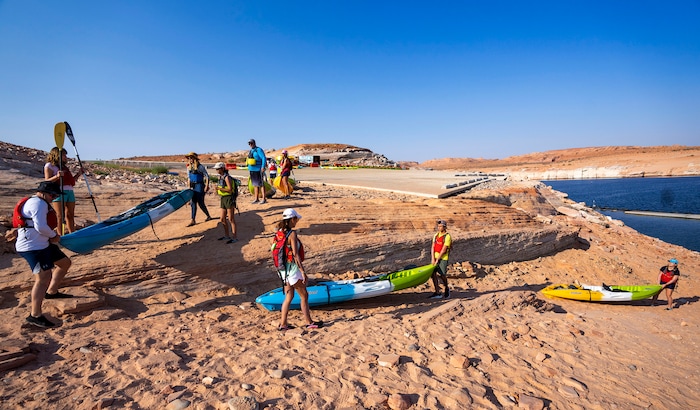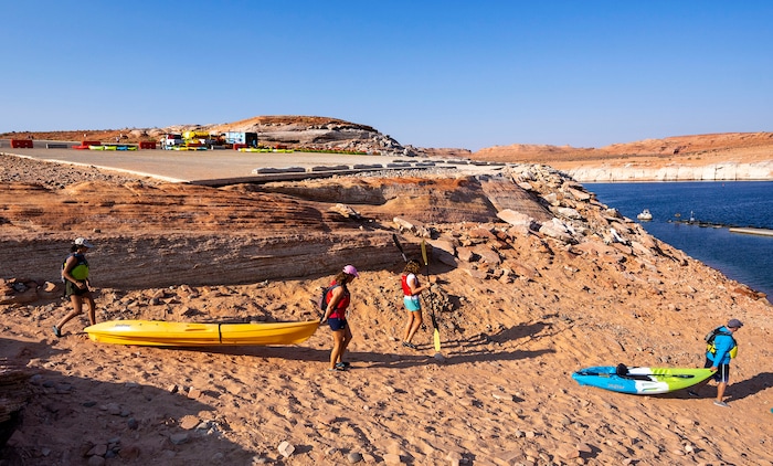 The concrete slope of the Antelope Point Launch Ramp hasn’t touched water since last winter due to dropping reservoir levels, and like other paddling guides who offer tours near Page, Ariz., the 23-year-old Pulliam has grown used to hauling heavy kayaks up the steep, sandy slope that now separates the ramp from the water.