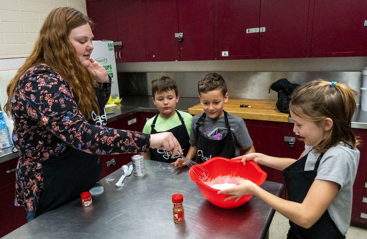 (Rick Egan | The Salt Lake Tribune) Kambron Carlson teaches Hugh, Zach and Gwen to make pumpkin bars, in the Junior Chef Cooking Class at the Marshall White Center, in Ogden, on Wednesday, Nov. 17, 2021