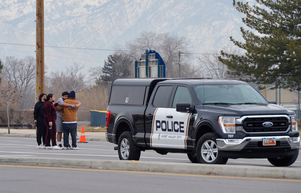 On Thursday afternoon, numerous people gathered in groups near the scene on the lawn of the Latter-day Saint seminary building at the edge of the high school’s campus, as well as on the sidewalk along 4100 South.
