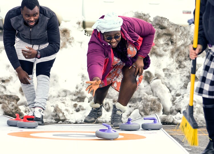 (Leah Hogsten | The Salt Lake Tribune) Freddy Sime and his wife, Edith, try their hand at curling during Saturday's Olympic Celebration in Park City on the Bob Wells Plaza, Feb. 12, 2022.