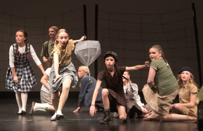 (Rick Egan | The Salt Lake Tribune) Mueller Park Junior High students, playing children from West Berlin, chase handkerchiefs with candy bars attached in a production of "The Berlin Candy Bomber" at Woods Cross High School, Saturday, Nov. 11, 2017.