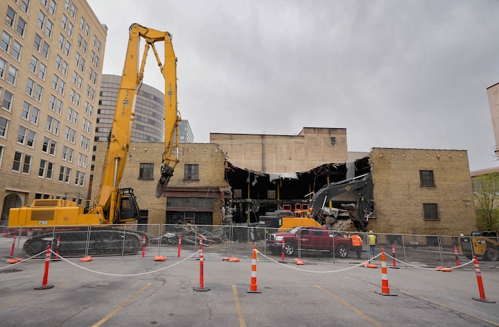 (Francisco Kjolseth | The Salt Lake Tribune) Crews begin tearing down the historic Utah Theater in downtown Salt Lake City on Tuesday, April 19, 2022.