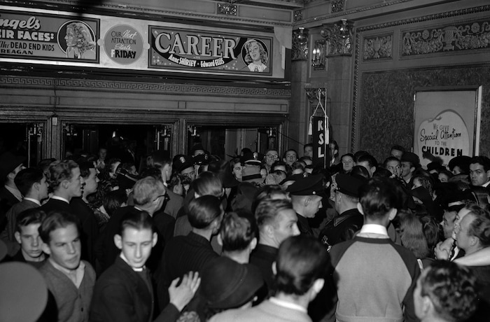(The Salt Lake Tribune) A large crowd fills the lobby of the Utah Theater in 1939.