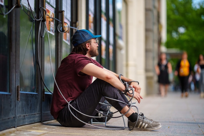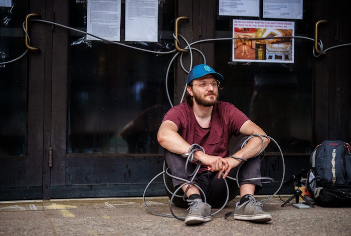 (Trent Nelson | The Salt Lake Tribune) Michael Valentine, chained to the Utah Theatre in Salt Lake City on Tuesday, June 8, 2021.