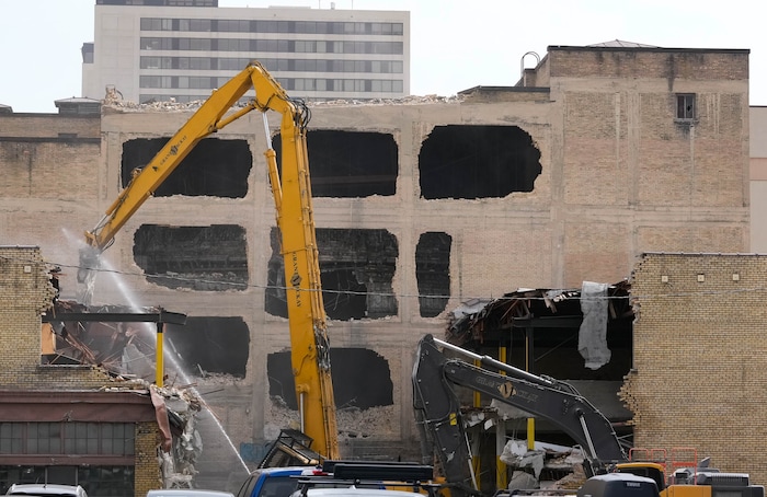 (Francisco Kjolseth | The Salt Lake Tribune) The final walls of the Kearns Building parking garage are taken down as part of demolition of the adjacent historic Utah Theater on Friday, April 29, 2022.