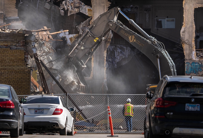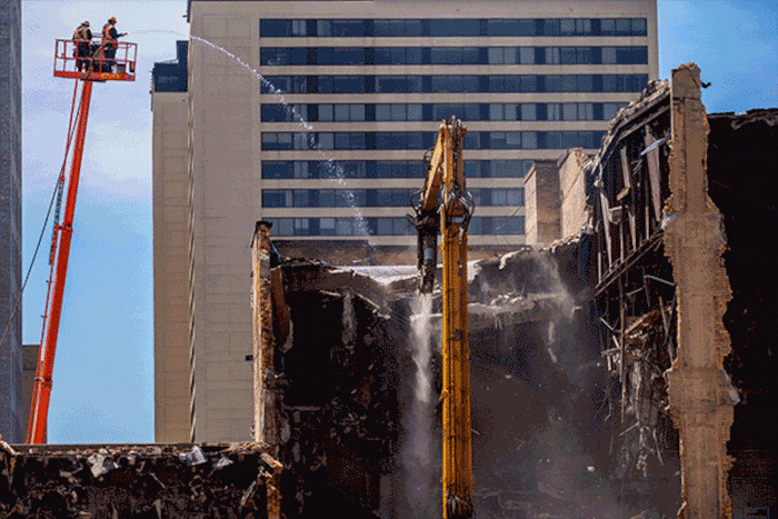 (Francisco Kjolseth | The Salt Lake Tribune) Crews begin tearing down the historic Kearns Building parking garage to make room for the planned demolition of the Utah Theater behind it on Tuesday, April 19, 2022. A group called Friends of the Utah Pantages Cinematic Theatre filed and emergency stay in a brief with the Utah Supreme Court in a final attempt to save the historic theater.