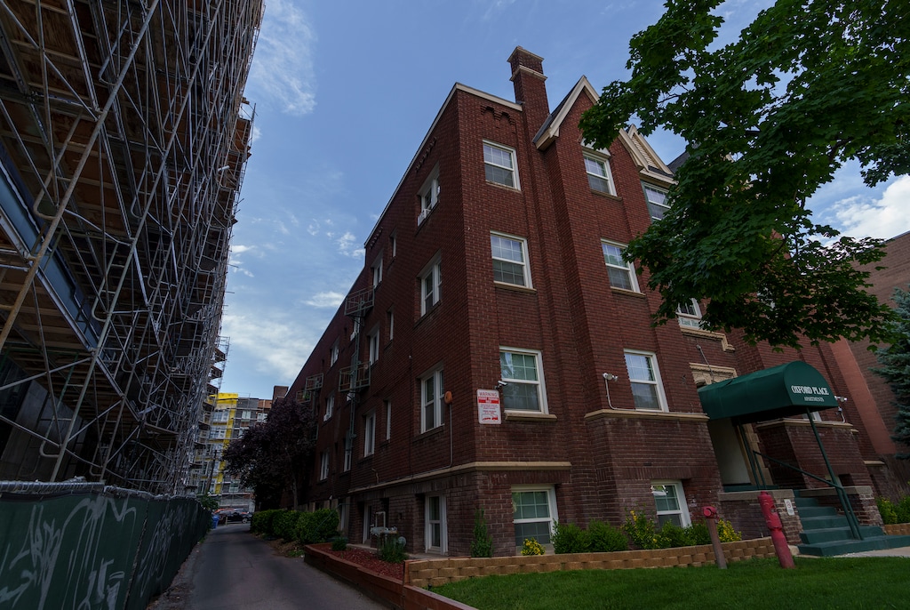 (Leah Hogsten | The Salt Lake Tribune) Older apartment buildings are shadowed by cranes on the downtown city skyline, Tuesday, July 12, 2022. A new study says gentrification is rampant across Salt Lake City, with new development and rising rents squeezing out existing residents and cherished businesses and leaving no affordable neighborhoods in terms of housing.
