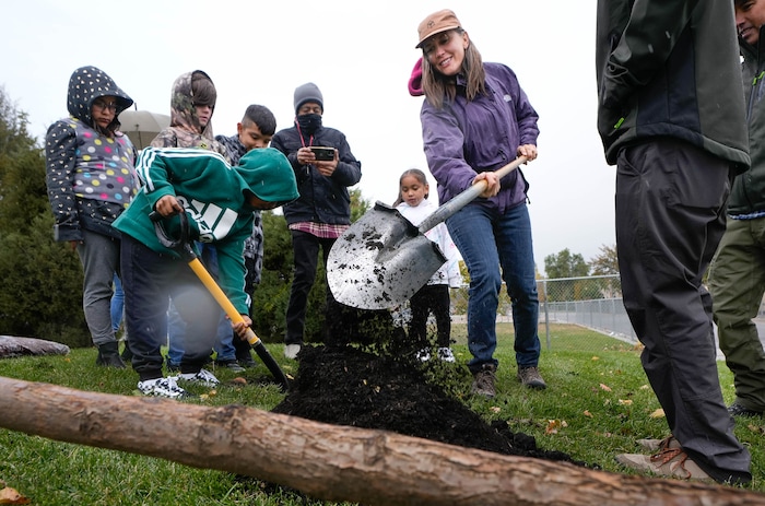 Third graders from Meadowlark Elementary School were equipped with hoodies for the cold, rainy day and with shovels to make a milestone happen at Meadows Park in west Salt Lake City.