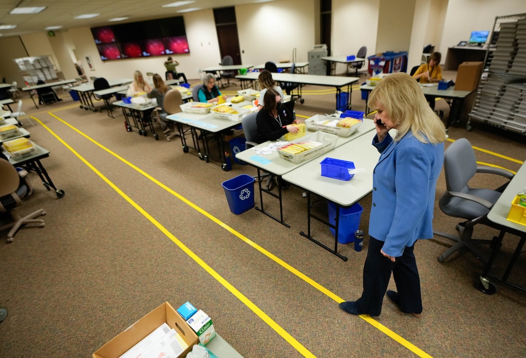 (Francisco Kjolseth | The Salt Lake Tribune) Salt Lake County Clerk Sherrie Swensen walks the corridors of the ballot-counting headquarters marked with yellow tape to show observers where they are allowed to stand, as she oversees her last election at the Salt Lake County Government Center on Tuesday, Nov. 8, 2022.
