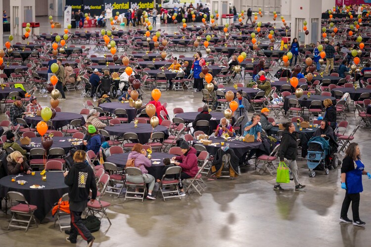 (Trent Nelson | The Salt Lake Tribune) "OG" Wayne and Barbara Regules have their Thanksgiving meal as the Miller family provides more than 3,000 meals for people experiencing homelessness at the Salt Palace Convention Center in Salt Lake City on Monday, Nov. 21, 2022.
