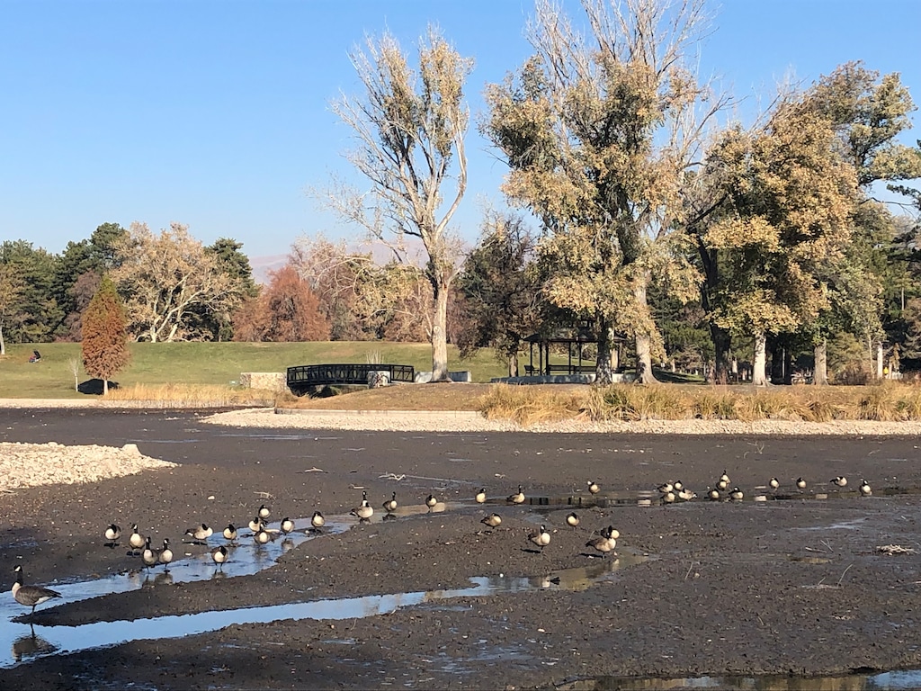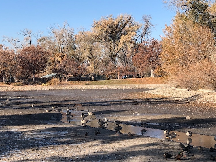 On Monday morning, dozens of ducks and geese had congregated around the narrow, shallow stream now at the bottom of the pond bed. Some were swimming, but most were just standing on one foot in the water and icy mud.