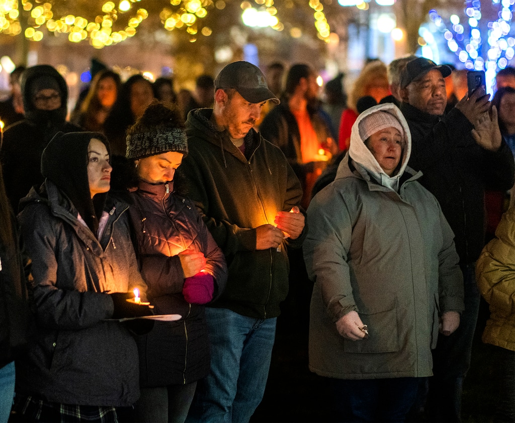 Attendees gathered in front of the stage, lit from behind by the soft, yellow glow of Christmas lights strung in park trees and by the white tapered candles they held in memory of those who had died.