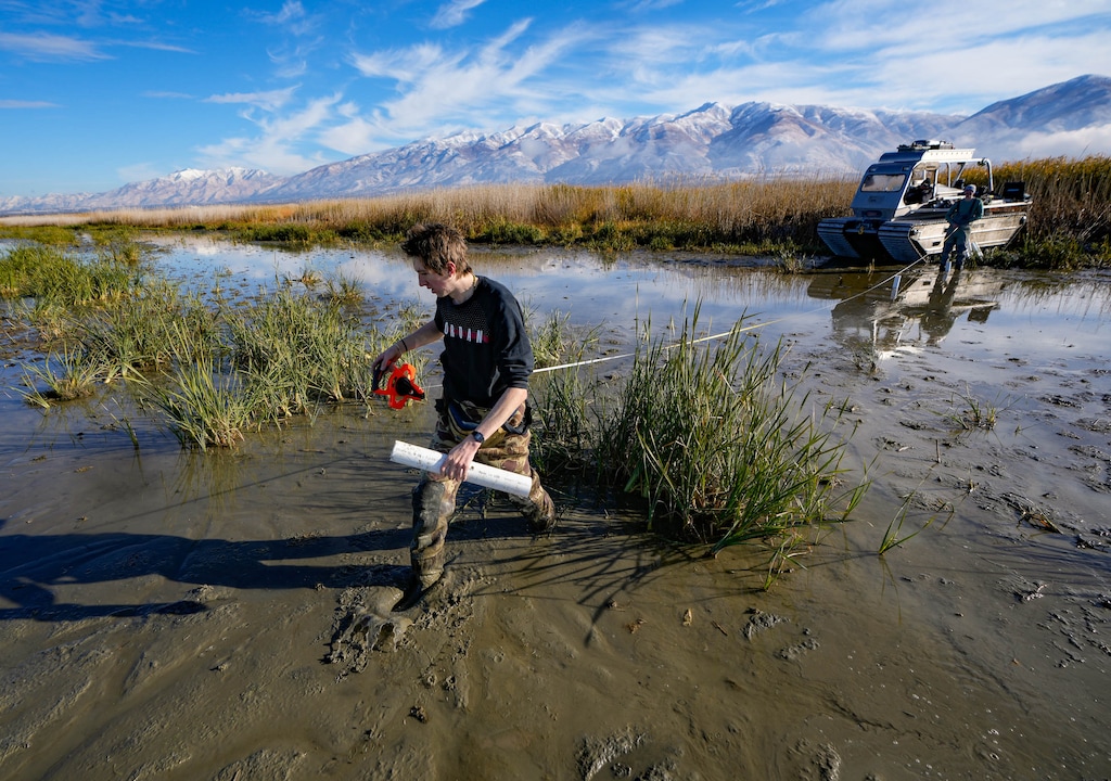 (Francisco Kjolseth | The Salt Lake Tribune) Alex Engstrom, a University of Utah graduate student in geoscience groundwater hydrology, installs a monitoring device used to measure groundwater seepage in Farmington Bay on Nov. 3, 2022.