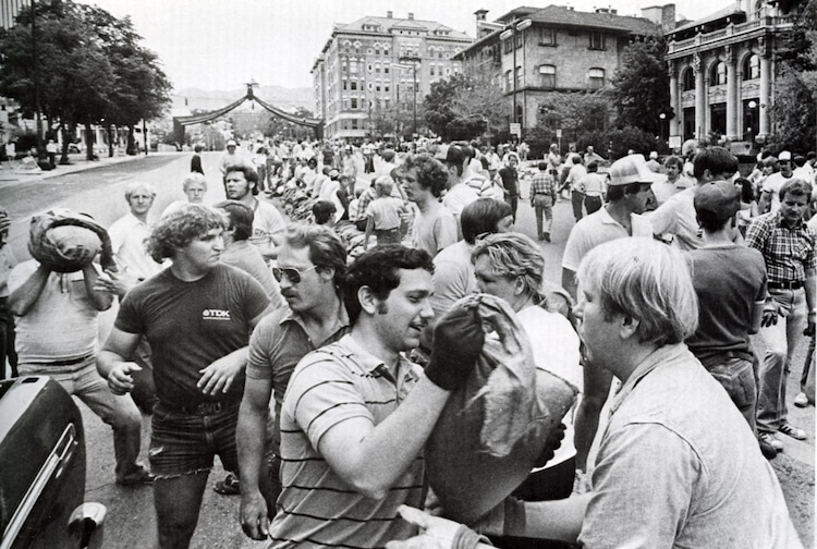 (The Salt Lake Tribune) Volunteer workers pass sandbags in an effort to control flooding in City Creek Canyon during the flood of 1983 in Salt Lake.