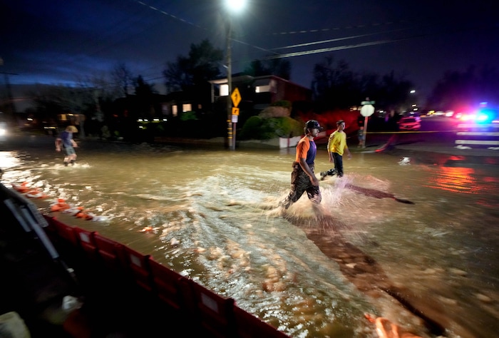 Nearby, crews were monitoring the creek’s rising flow and watching another section of land that seemed unstable as community members worked to distribute sandbags to each other into the evening.