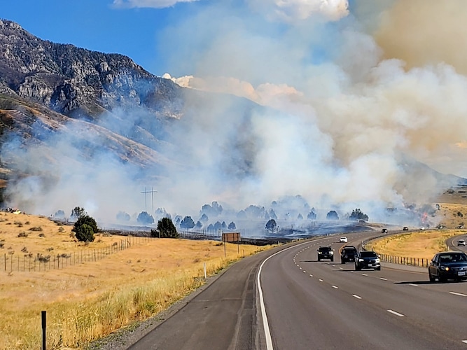 (Utah Wildfire Info) Firefighters work the Precision Fire along Interstate 15 south of Santaquin on Saturday, July 16, 2022. Lower elevations are more at risk of wildfires during wet years like 2023.